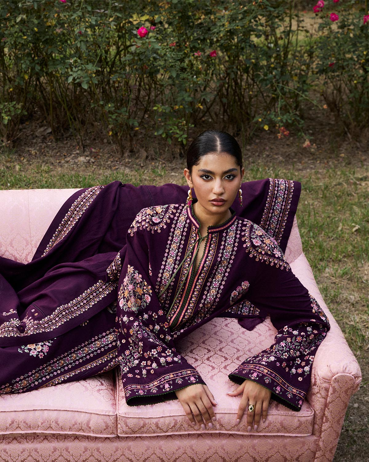 Description: A long purple shirt enriched with traditional embroidery and tassels, flanked by flowing bell sleeves. Matching embroidered shalwar and scarf echo the artistry, wrapping the look in heritage-inspired refinement.