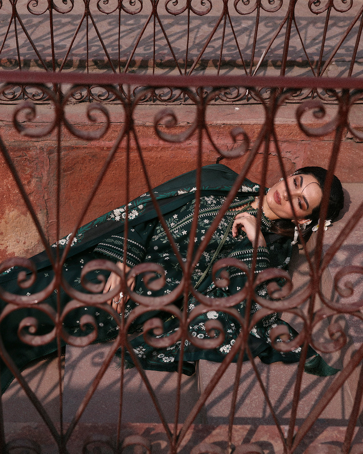 Description: This elegant ensemble showcases a monochrome floral embroidered shirt adorned with intricate threadwork, exuding timeless grace. The sleeves echo the same delicate detailing, while the traditionally embroidered trouser adds a refined charm. Finished with a printed wool shawl, this look embodies classic sophistication and timeless elegance.