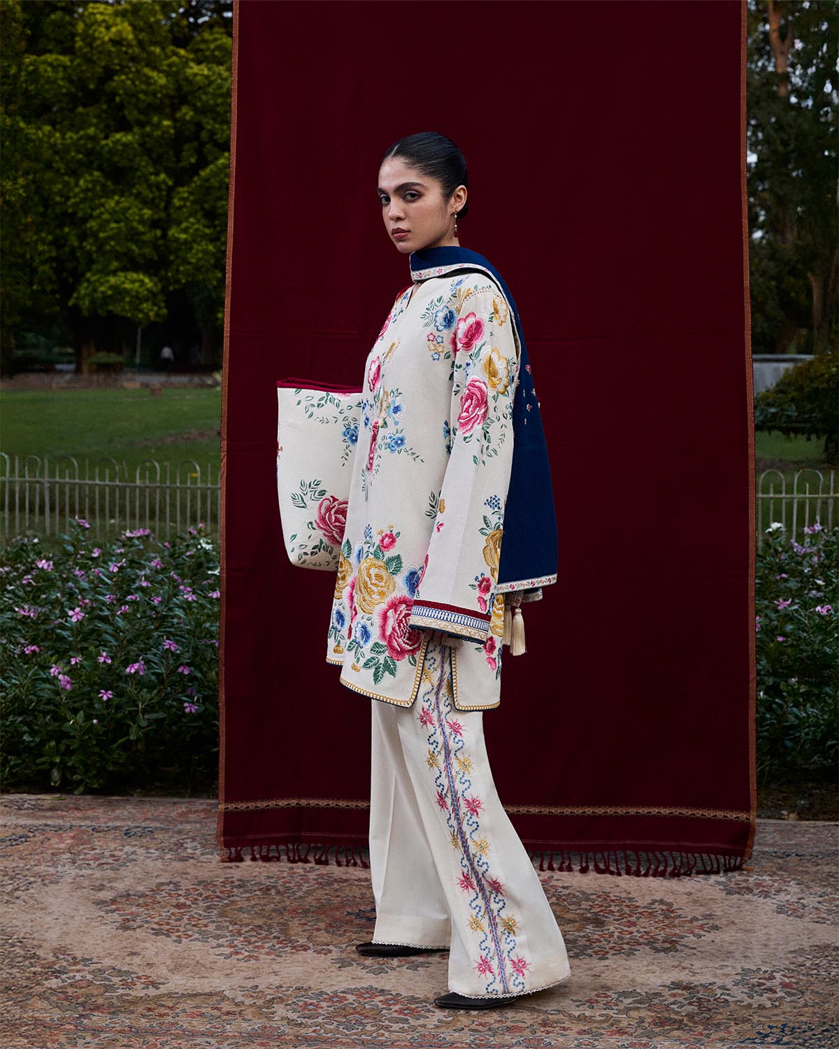 Description: An ivory short shirt with delicate floral embroidery, matched with sleeves that carry the same blooming artistry. Paired with ivory trousers and a contrasting blue scarf, the look whispers romance with a painterly touch.