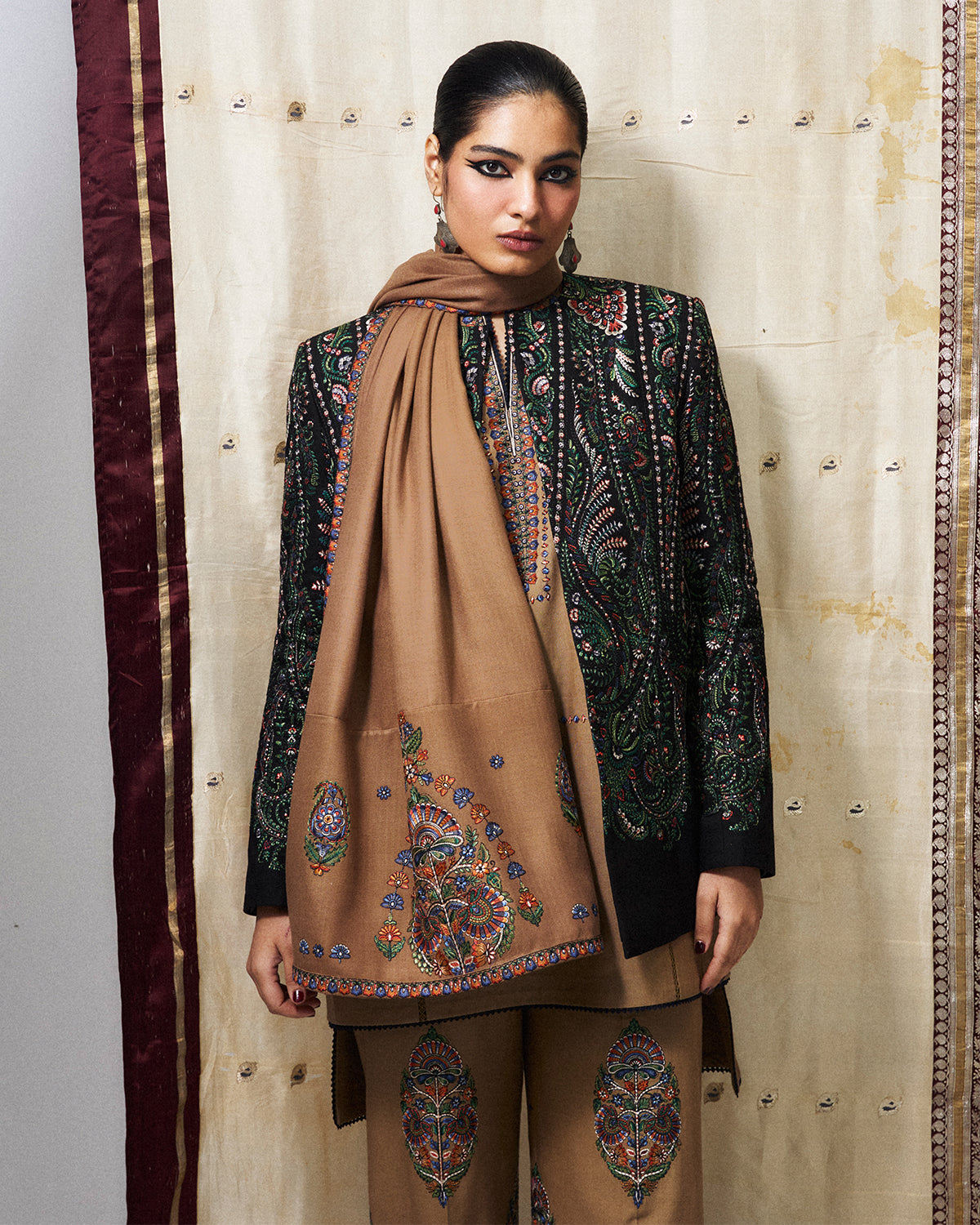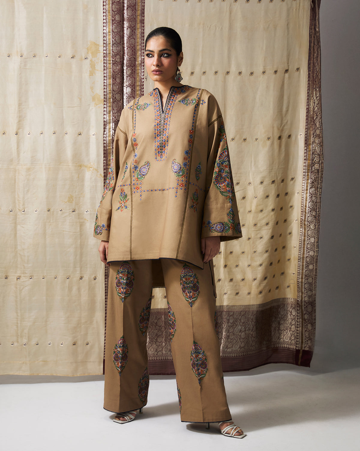 Description: A beige asymmetrical short shirt, beautifully adorned with intricate multicoloured traditional embroidery across the front and sleeves, adding depth and artisanal charm to the silhouette. It is paired with matching beige bootcut pants, richly detailed with complementary embroidery, and completed with a coordinating scarf that echoes the vibrant motifs. The ensemble harmoniously blends traditional craftsmanship with modern design, creating an elegant amd timeless look.